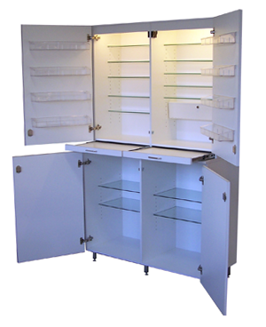- yläkaapit varustettu valaisimilla, kymmenellä lasihyllyllä, kahdeksalla ovilokerolla sekä lukittavalla N-lokerolla